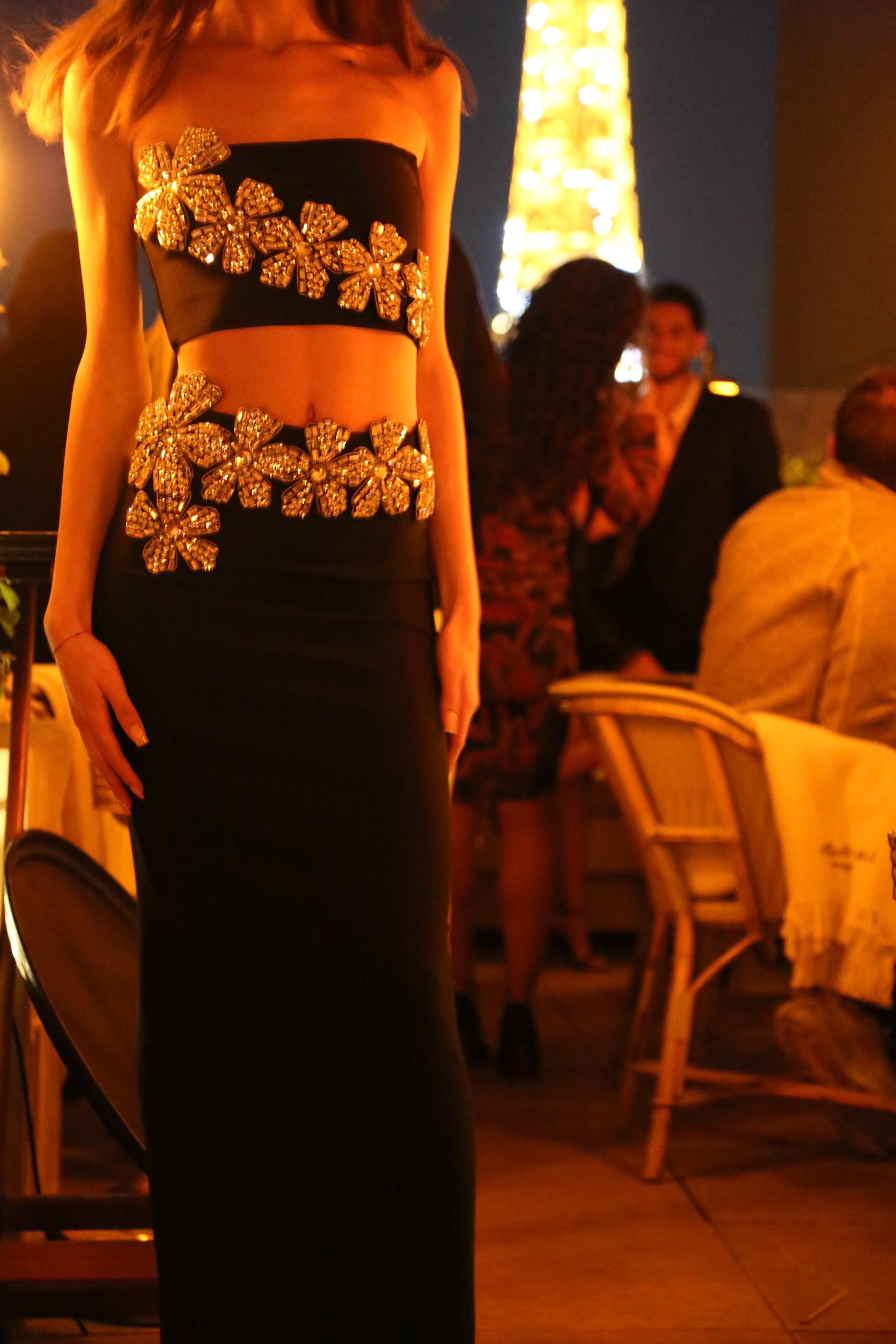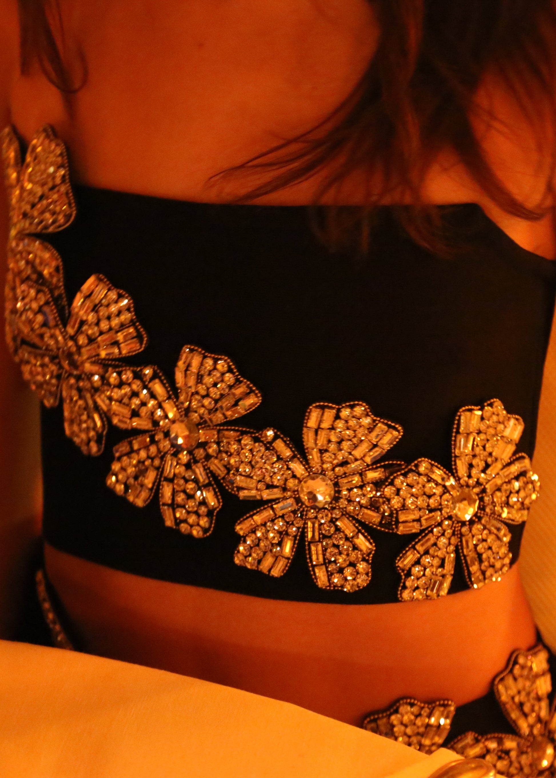 L'ensemble est un ensemble deux pièces bandage exquis conçu pour rehausser votre style avec une élégance sans effort. Doté d'un haut bandage chic qui épouse parfaitement votre silhouette, ce superbe ensemble est confectionné dans un luxueux tissu noir orné de délicats accents floraux et de détails en cristal étincelants. Complétez le look avec des boucles d'oreilles audacieuses et des chaussures à talons, et faites une déclaration de mode raffinée qui fera tourner les têtes en toute occasion. Soyez confiante et séduisante avec l'ensemble bandage orné de cristaux.